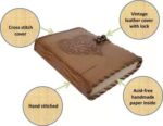 vintage handmade leather journal. Crafted with genuine leather, it radiates authenticity and charm, perfect for those who appreciate classic craftsmanship. The premium antique lock closure adds a touch of elegance and security, ensuring your thoughts and memories are safeguarded within its pages. Inside, you’ll discover 200 White handmade pages, providing ample space for your musings, sketches, and stories to unfold. Whether it’s for journaling, sketching, or planning, this versatile journal is a timeless companion for your creative endeavors. Treat yourself or a loved one to this exquisite piece, a celebration of tradition and creativity